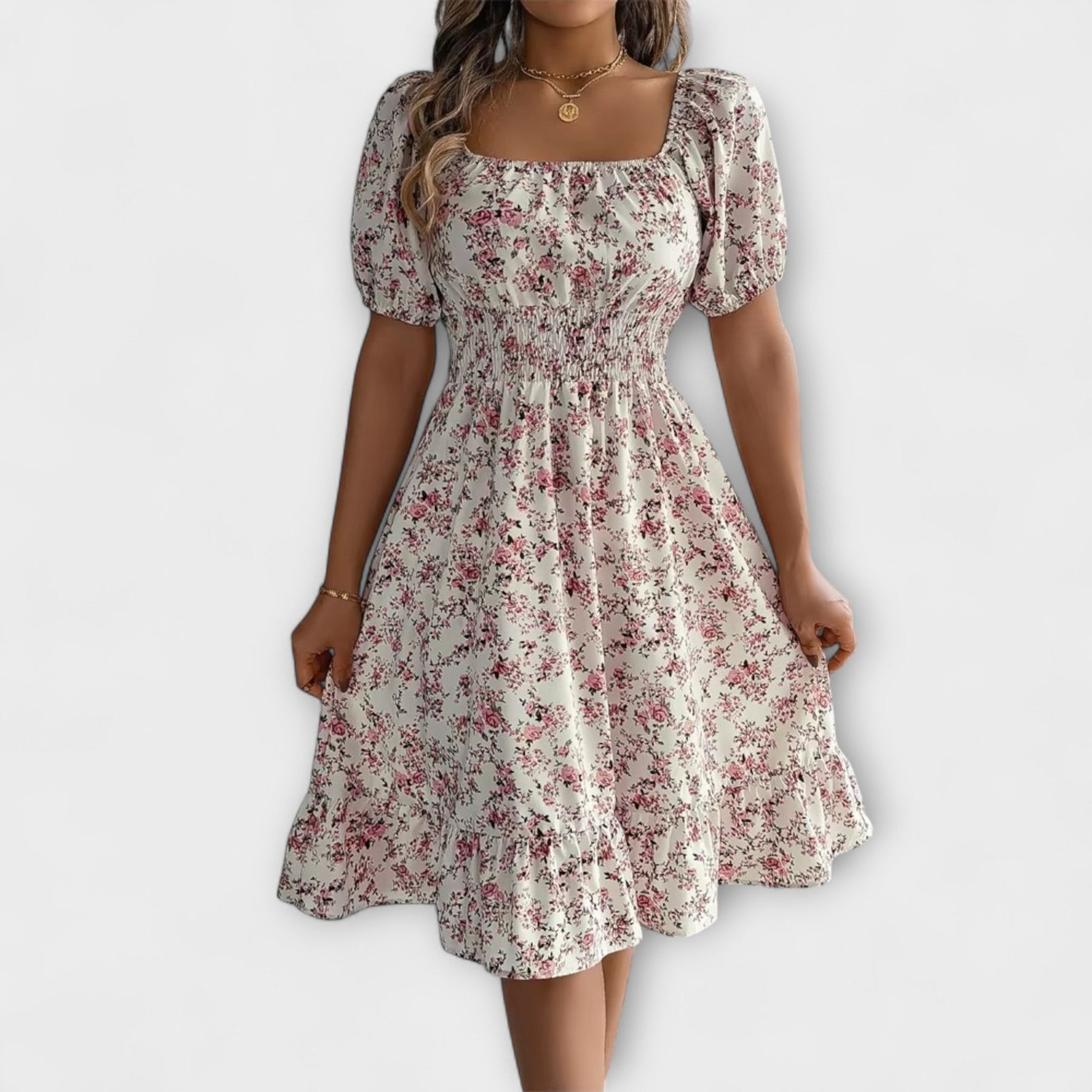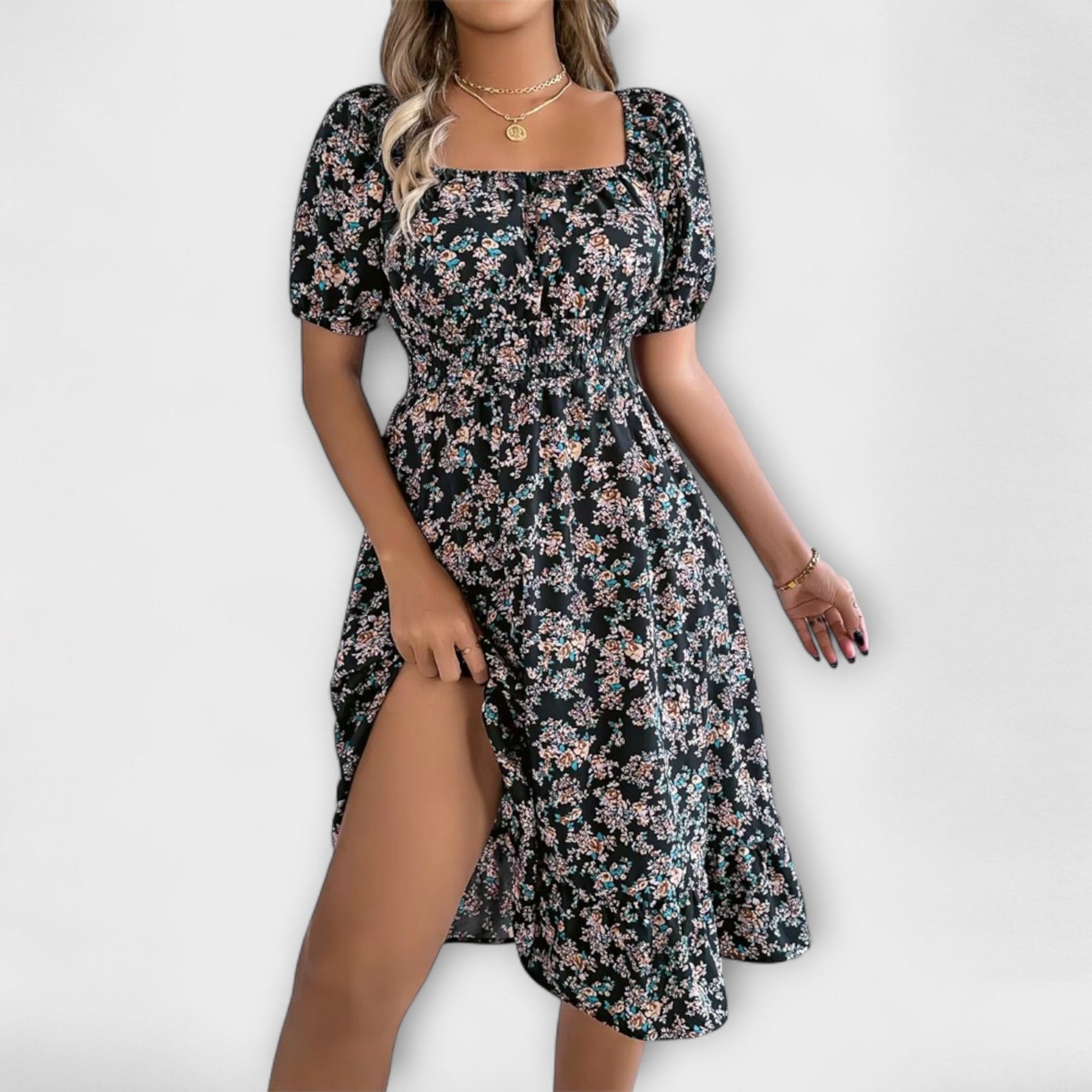 El vestido veraniego Nora combina un femenino diseño de flores con un corte ligero y cómodo – perfecto para días cálidos y noches brillantes. Ya sea para un picnic, vacaciones o una visita a una cafetería, este vestido te ofrece un look fresco y elegante.